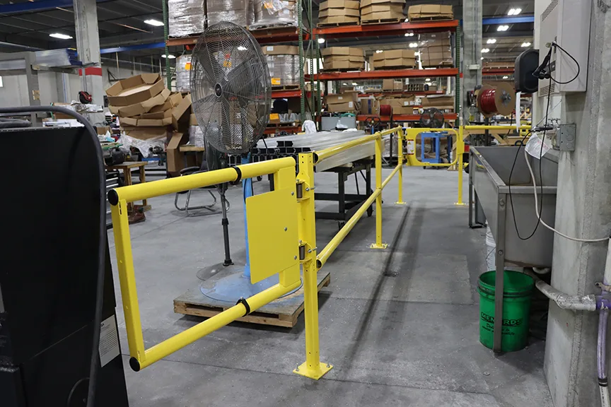 Warn personnel about dangerous or off-limits areas with this durable, floor-level gate. It swings bidirectionally (both ways) to allow pedestrians to enter or exit an access-restricted area. For example, it can be used to protect areas in which personnel and forklifts share the same traffic spaces. It has an incredibly long spring life (tested to 1 million cycles so far) and is adjustable from 21 to 48 inches. The EdgeSafe® Personnel Access Gate makes no noise when it closes, and because the free end does not contact the railing, the opening width is variable. It is compatible with other EdgeSafe products.