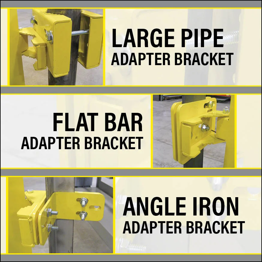 Please reference Adapter Bracket mounting guidelines below. Adapter Brackets are available in three finishes: Powder Coat Yellow, Stainless Steel or Hot Dipped Galvanized. This product is compatible with all PS Safety Access EdgeHalt Ladder Safety Gate products.